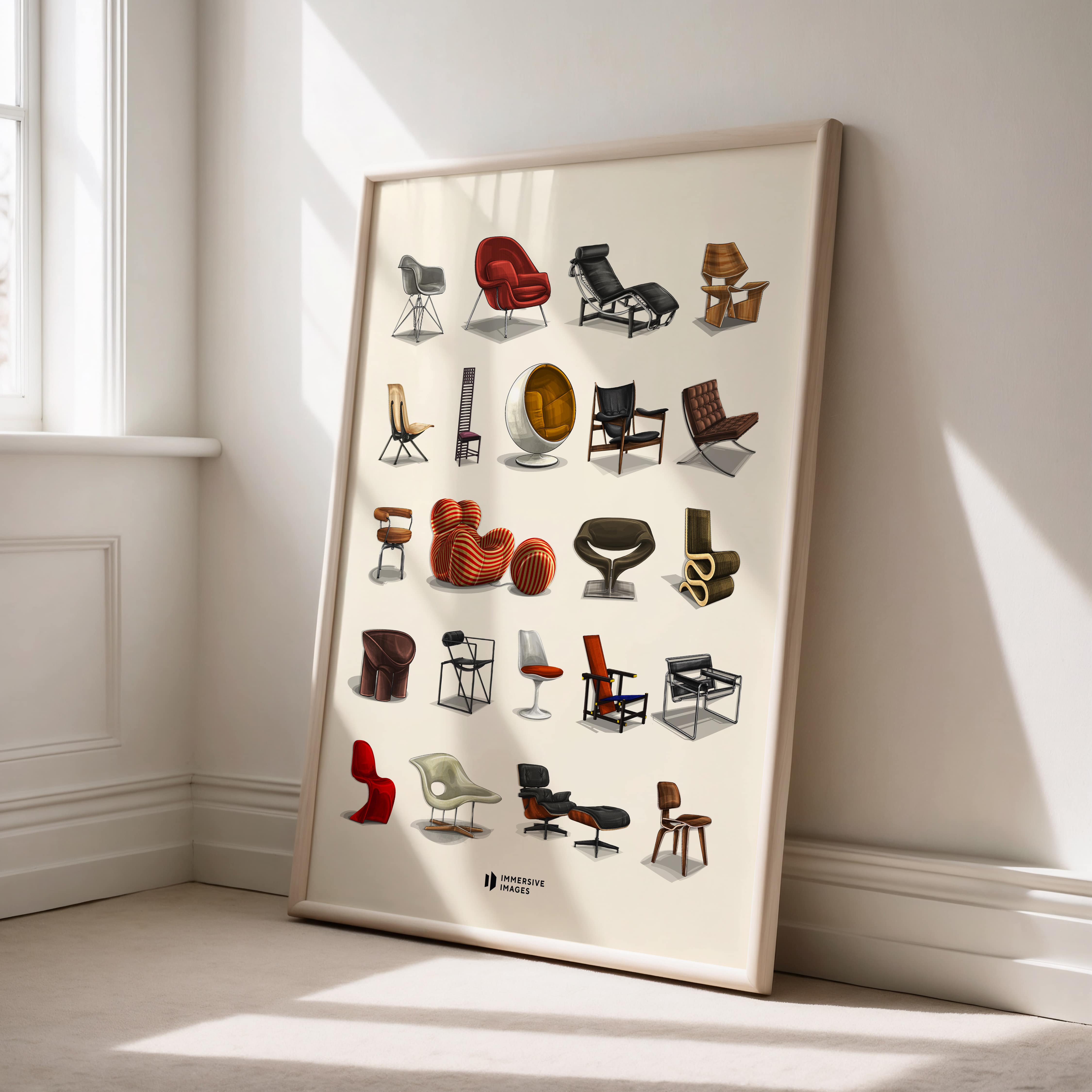 Tasarım tutkunları için özenle hazırlanan bu poster, mobilya tarihine damga vurmuş en ikonik sandalye ve koltukları bir araya getiriyor. Her biri tasarım dünyasında bir dönüm noktası olan bu parçalar, estetik ve işlevselliğin mükemmel uyumunu gözler önüne seriyor.